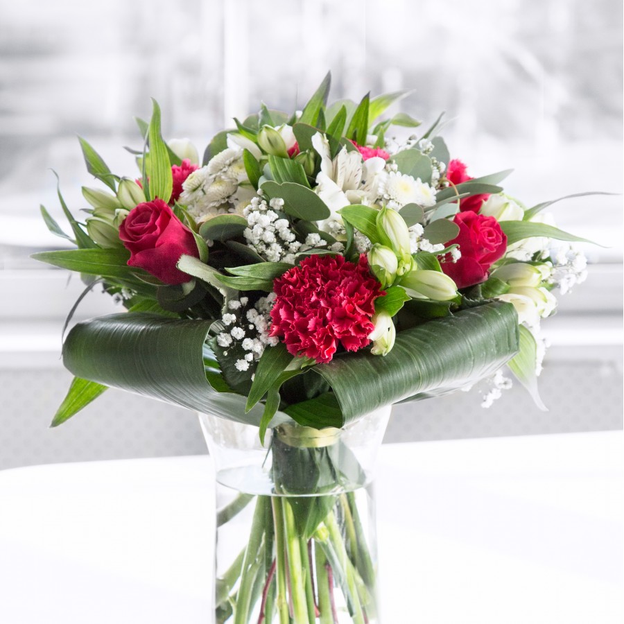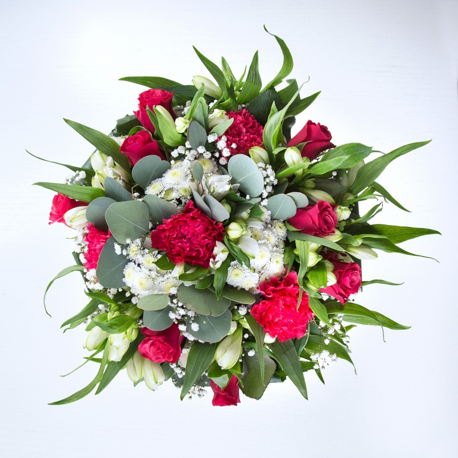 Experience the stunning beauty of our exclusive bouquet, featuring rich red roses paired with elegant white chrysanthemums. Accented by delicate gypsophila and vibrant carnations, this arrangement is beautifully complemented by white alstroemeria and lush aspidistra leaves. Each flower is hand-selected to ensure exceptional freshness.